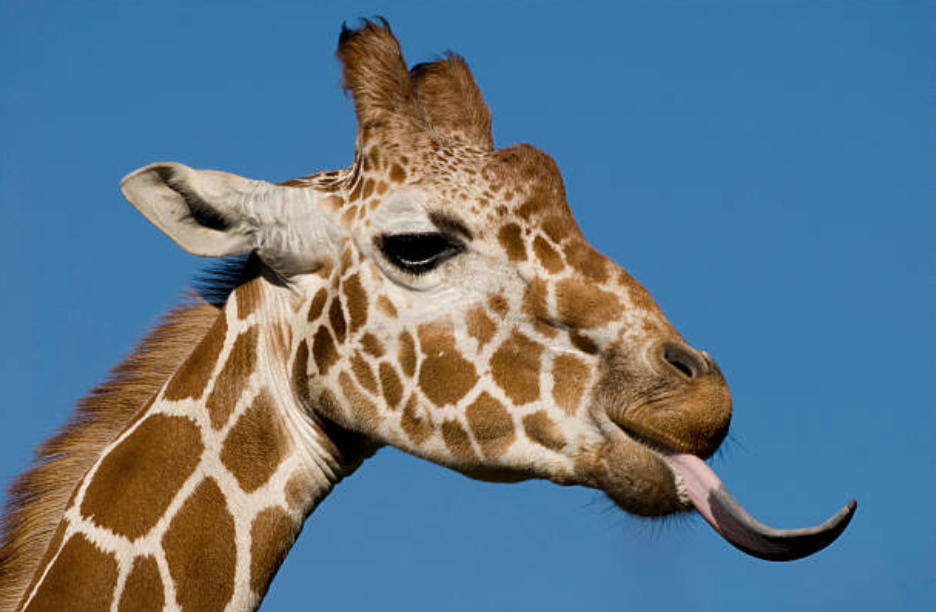 Grâce à son long cou et sa longue langue préhensile d’une cinquantaine de centimètres, elle peut atteindre facilement les feuilles les plus hautes, inaccessibles à la plupart des autres herbivores.