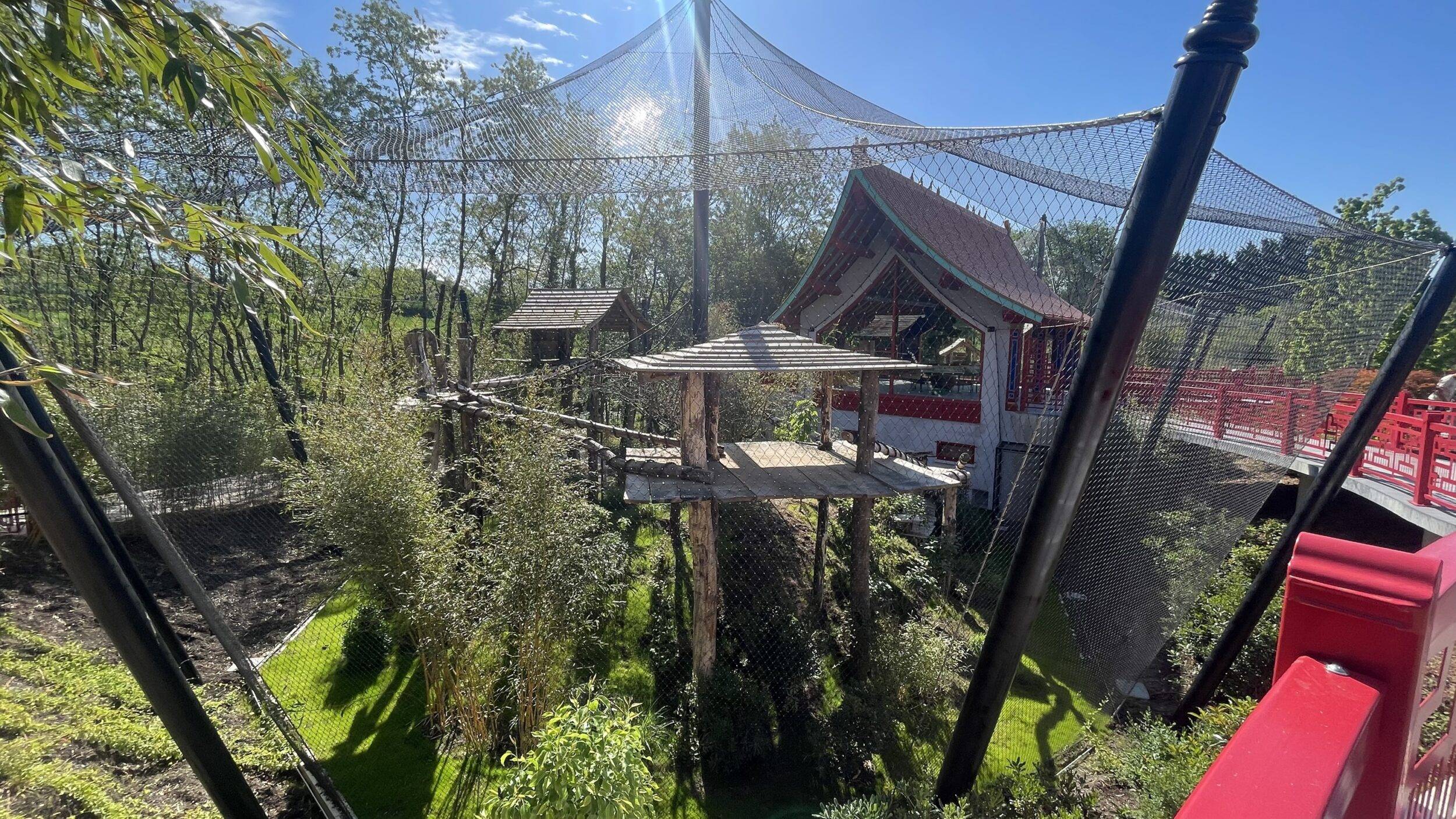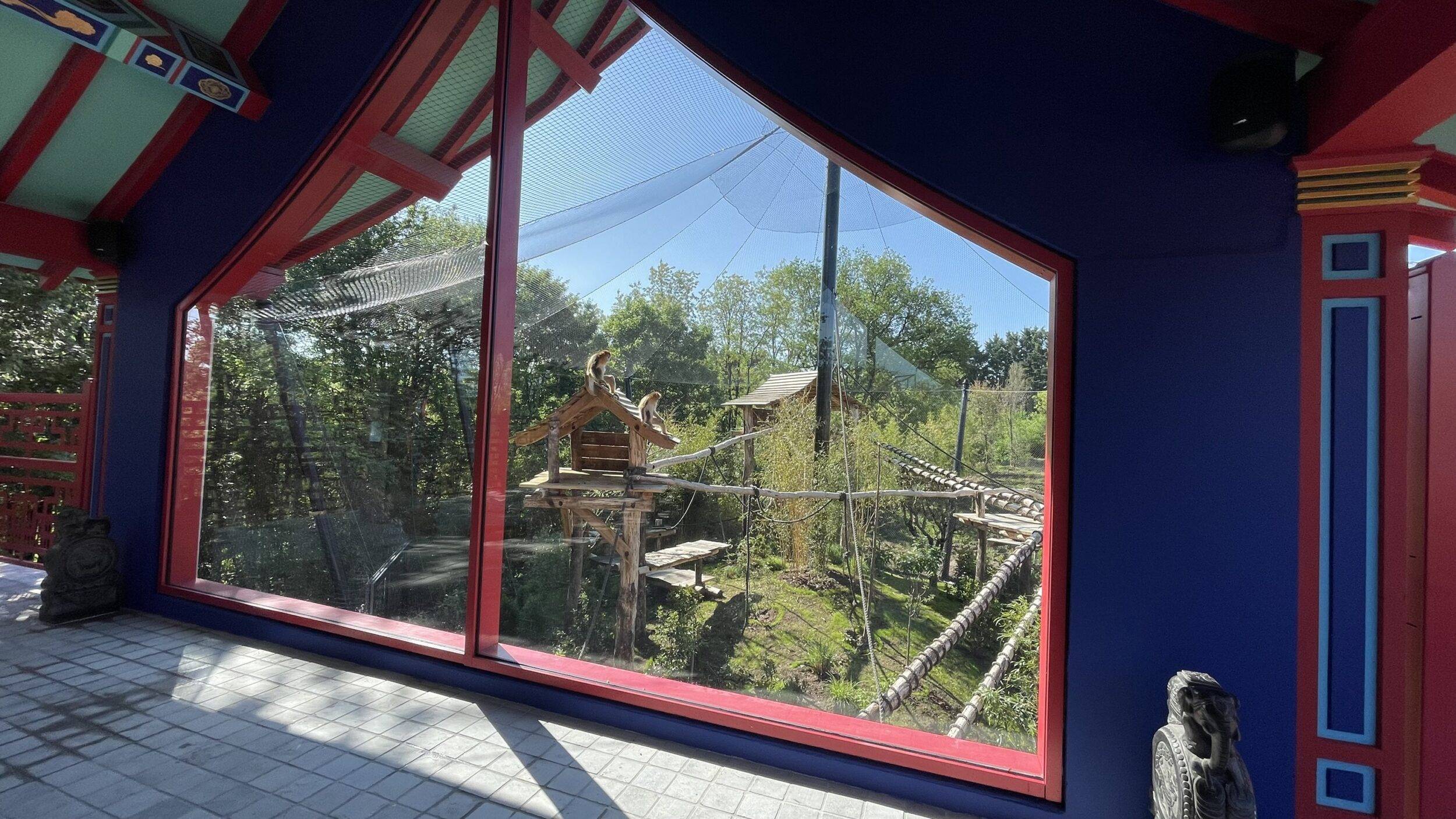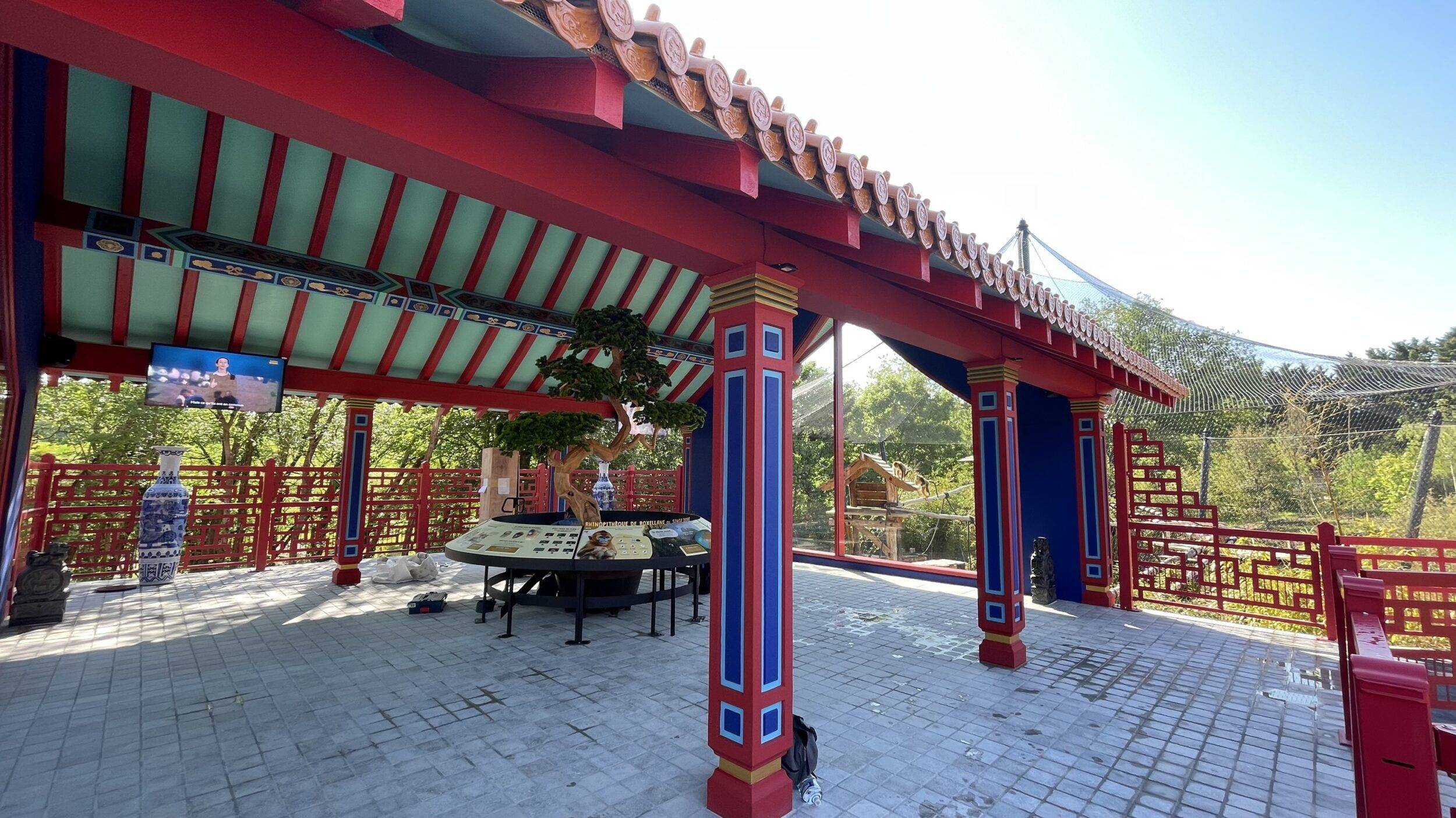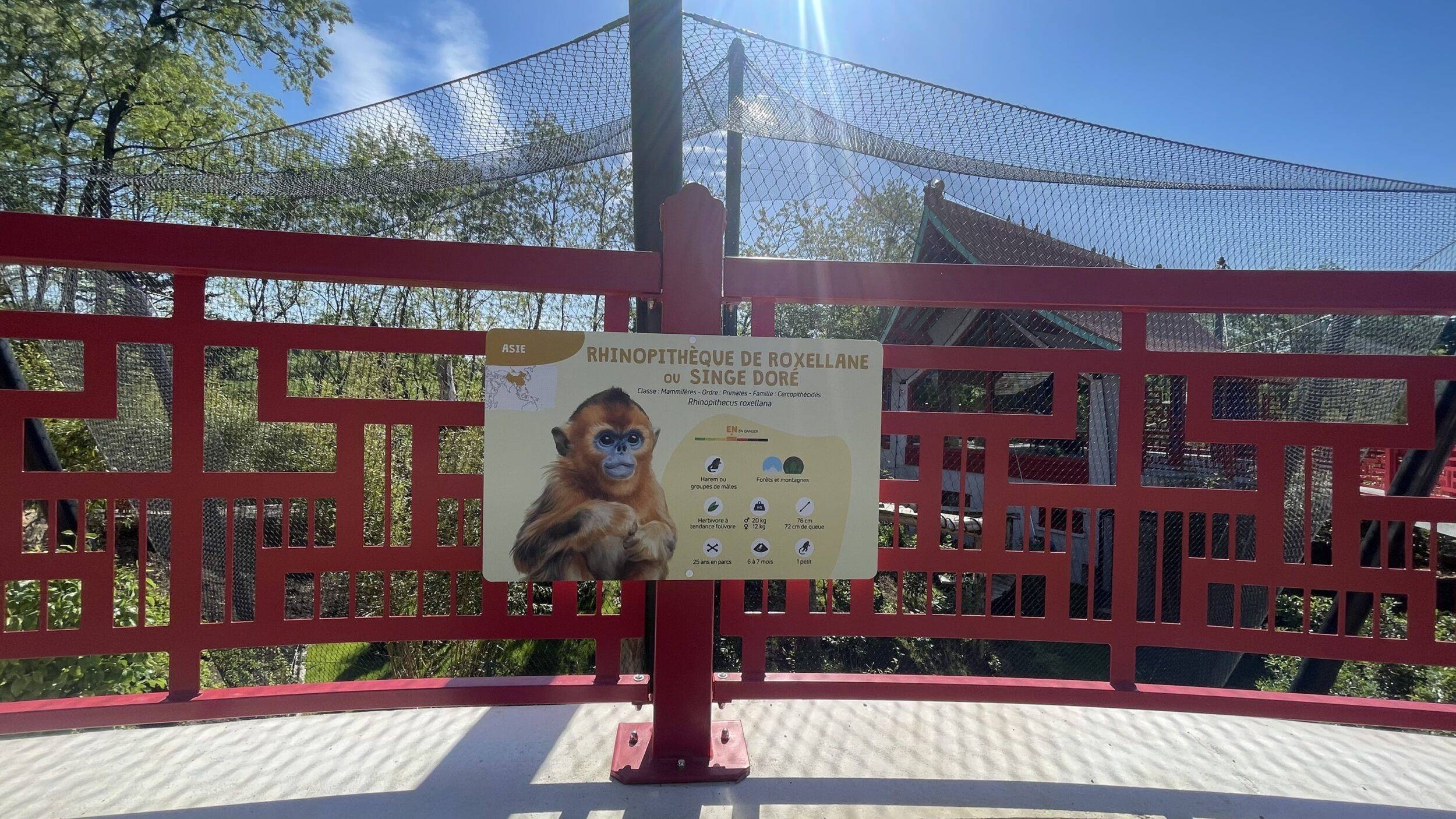 Il a fallu bâtir en moins de six mois un espace à la fois esthétique, fonctionnel et adapté au bien-être de ces nouveaux animaux. « Nous avons conçu deux installations pour pouvoir éventuellement séparer les animaux et pouvoir garder plus d’animaux lorsqu’il y aura des jeunes. Nous espérons que le groupe va grandir, nous pourrons les passer de l’une à l’autre installation, et s’il y a un animal à isoler un jour, nous le pourrons. » L’installation des singes dorés comprend un bâtiment central qui abrite un vaste observatoire sous lequel se trouvent les loges intérieures elles-mêmes reliées à deux volières extérieures. Celles-ci sont dotées de structures pour permettre aux primates de grimper, de petits abris et d’endroits où se soustraire de la vue du public. Craignant les fortes chaleurs, les primates peuvent également profiter d’un système de brumisation artificielle ainsi qu’une végétation adaptée et originaire de Chine, leur permettant de trouver de l’ombre et de la fraicheur lorsqu’ils en ont besoin. L’ensemble est inspiré des architectures traditionnelles chinoises, avec ses toits vernissés et ses décors élégants. Pour les visiteurs, les passerelles d’accès sont précédées de porches chinois, eux aussi couverts de tuiles vernissées, longent les deux volières et mènent à l’observatoire aménagé en grand espace pédagogique, au centre de l’installation, pour mettre en valeur cette espèce exceptionnelle.