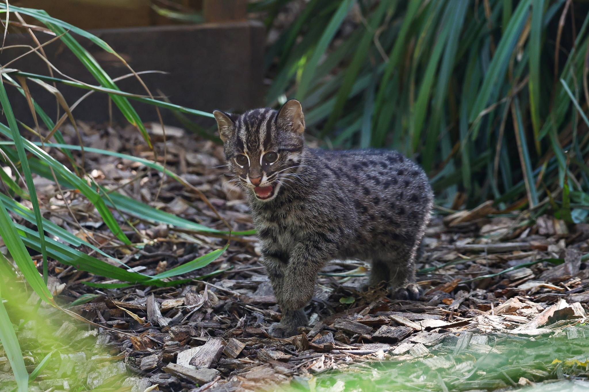 Le chat pêcheur (Prionailurus viverrinus) est un félin unique qui se distingue des autres espèces par ses étonnantes aptitudes aquatiques. Originaire des zones humides d’Asie du Sud et du Sud-Est, il chasse principalement du poisson grâce à ses pattes partiellement palmées, son pelage imperméable et son instinct redoutable de prédateur silencieux. Encore peu connu du grand public, il joue pourtant un rôle capital dans l’équilibre des écosystèmes de marais, rizières et mangroves. Aujourd’hui, l’espèce est malheureusement classée « Vulnérable » (VU) sur la liste rouge de l’UICN (Union Internationale pour la Conservation de la Nature), du fait notamment de la destruction de son habitat, de la pollution et des conflits croissants avec les humains. L’organisation internationale estime également sa population sauvage entre 3 000 et 7 500 individus matures dans le milieu naturel, notamment au Bangladesh, au Cambodge, en Inde, au Myanmar, au Népal ou encore en Thaïlande. Au sein des parcs zoologiques européens, l’EEP mis en place pour assurer la reproduction de l’espèce, et coordonné par le Parco Faunistico La Torbiera en Italie, a connu une baisse significative du nombre d’individus, passant de 90 chats pêcheurs à moins d’une soixantaine aujourd’hui. En France, l’espèce n’est visible que dans une poignée de parcs zoologiques qui enregistrent très rarement des naissances. Celle des deux chatons au Zoo de La Flèche cette année représente un événement au sein du programme de reproduction, et une véritable bonne nouvelle pour la conservation de cette espèce.